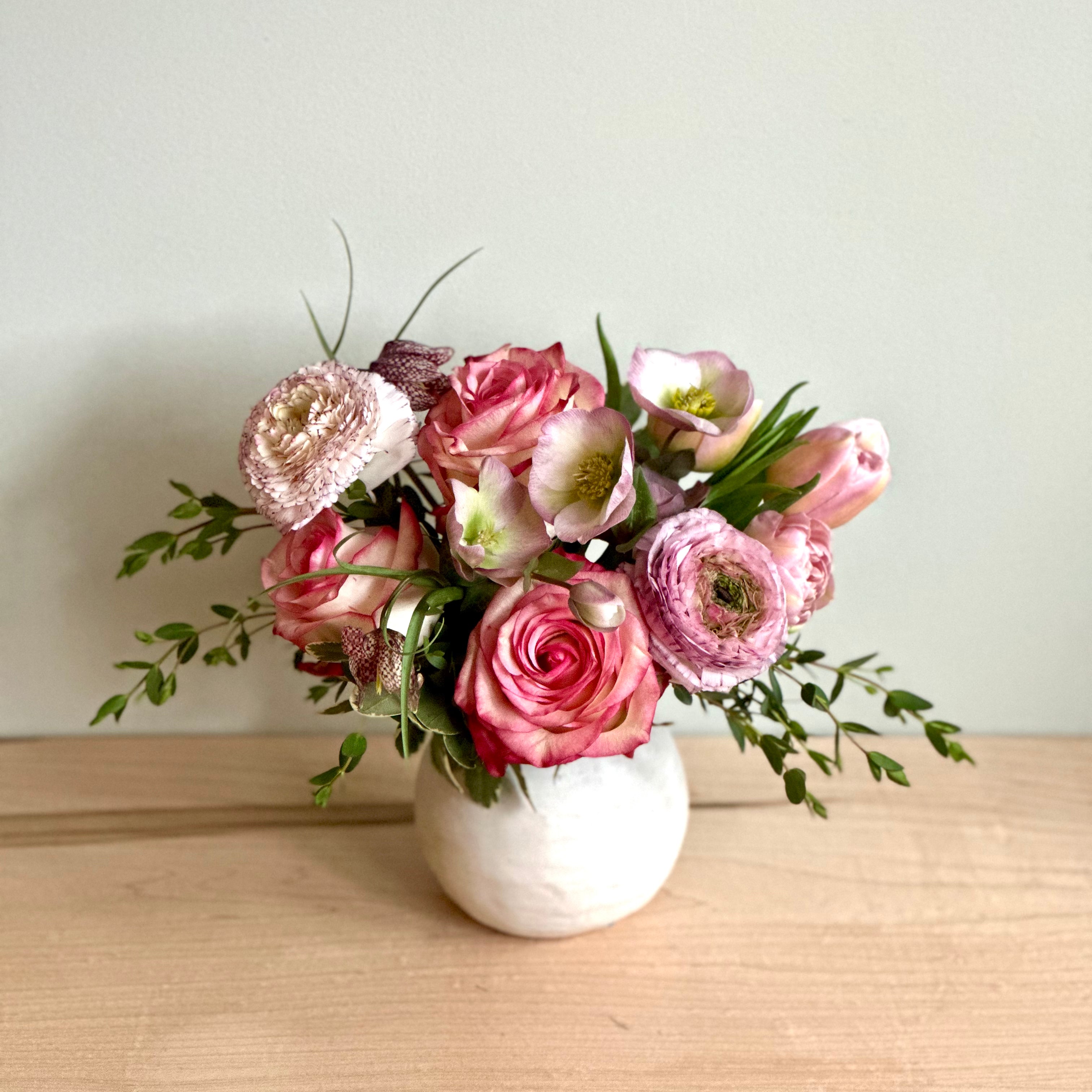 Our small MOTHER'S DAY arrangement features striking, premium blooms, like roses, double tulips, ranunculus, frittilaria, and helleborus. Overall size approximately 8”w x 8”h. Limited availability.