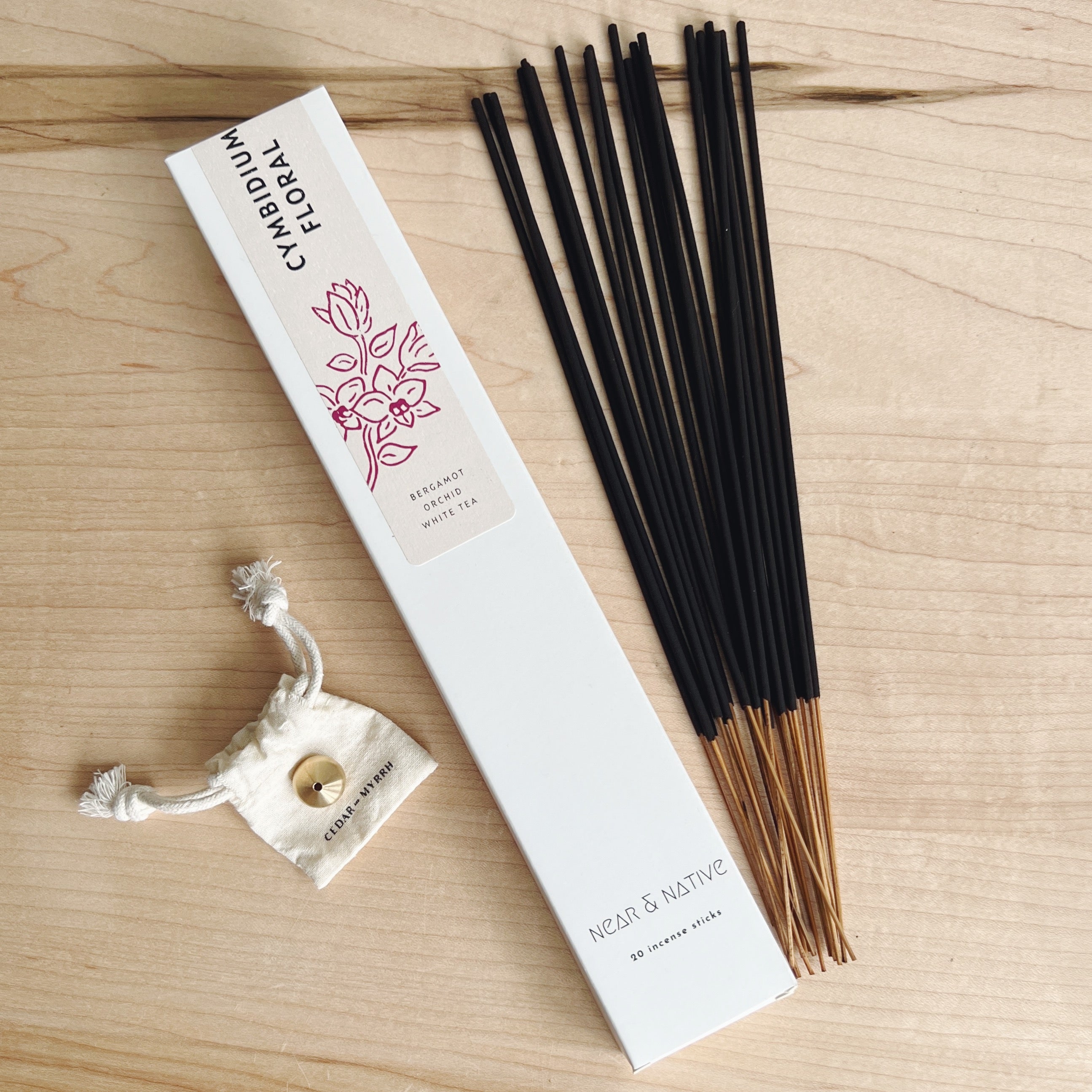 Infused with a softly floral and lightly sweet collaborative scent inspired by the Cymbidium Orchid, our signature scent is now offered in a box of twenty incense sticks. A complex blend of bergamot and sea salt with a fresh green floral and white tea core, sweetened with clover honey at the base. Paired with a simple brass incense holder for the perfect gift.