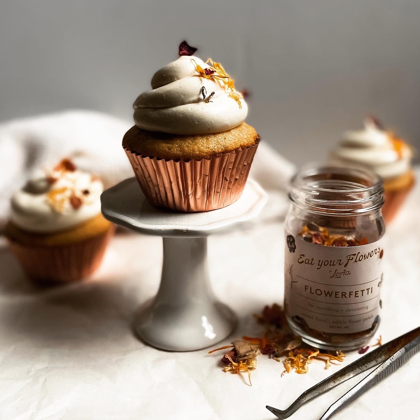We are thrilled to partner with the talented Jennifer Evans of Tender Crumb bakery in Exeter to create these Edible Flower Brown Butter + Caramel Cupcakes cupcakes.  This is not your average cupcake; consisting of a brown butter cake, caramel sauce filling, topped with a swirl of vanilla buttercream, and a sprinkle of "Flowerfetti", dried edible flower petals, from Eat Your Flowers