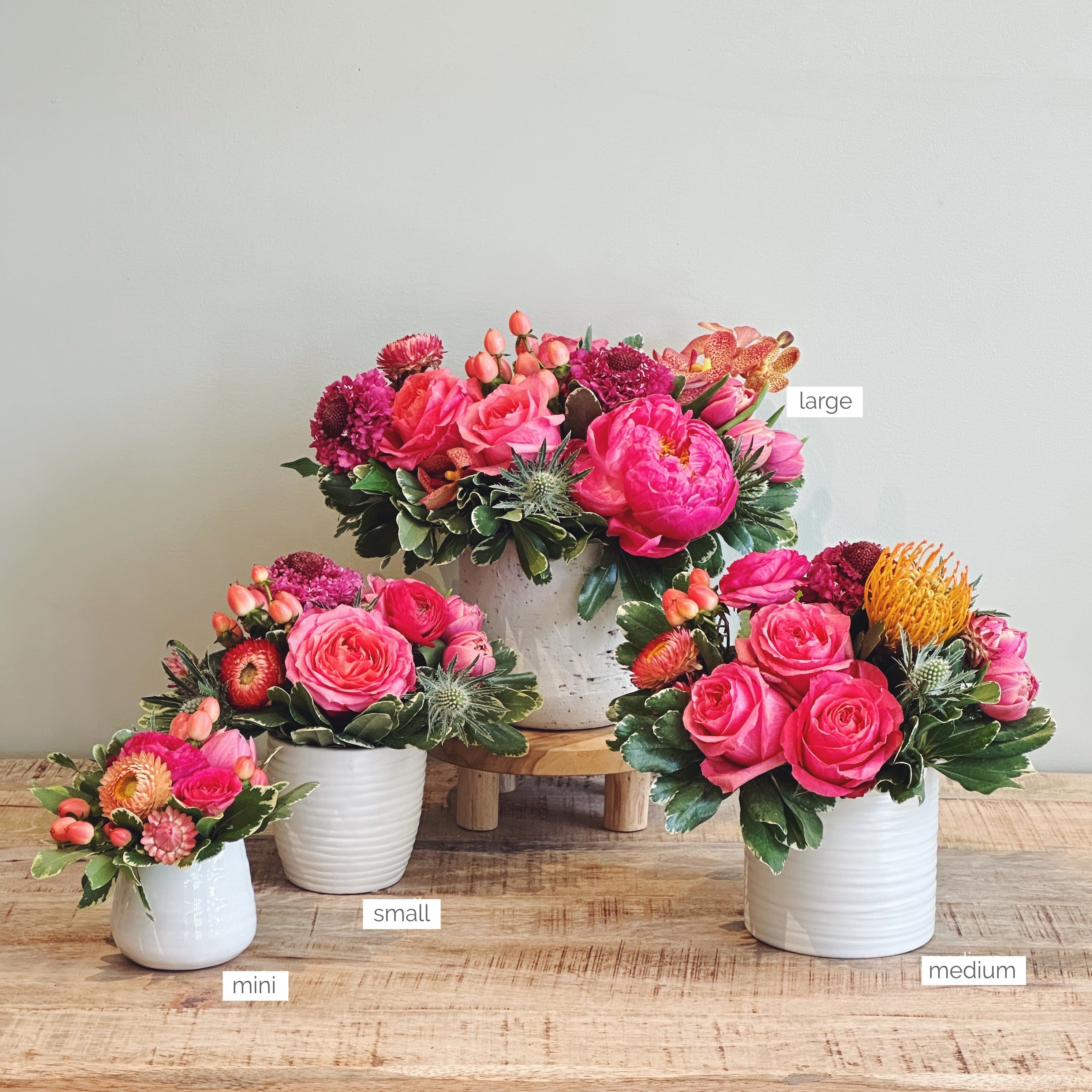 Our BOLD + BRIGHT signature arrangements are individually designed based on the size you’ve chosen. We'll be using the selection of flowers we have in the shop that day. Photos are examples only