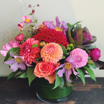 Bold and bright lush and low arrangement in orange, peach,  raspberry, and hot pink.  Flowers include garden-like roses, scabiosa, celoisa, and mint.
